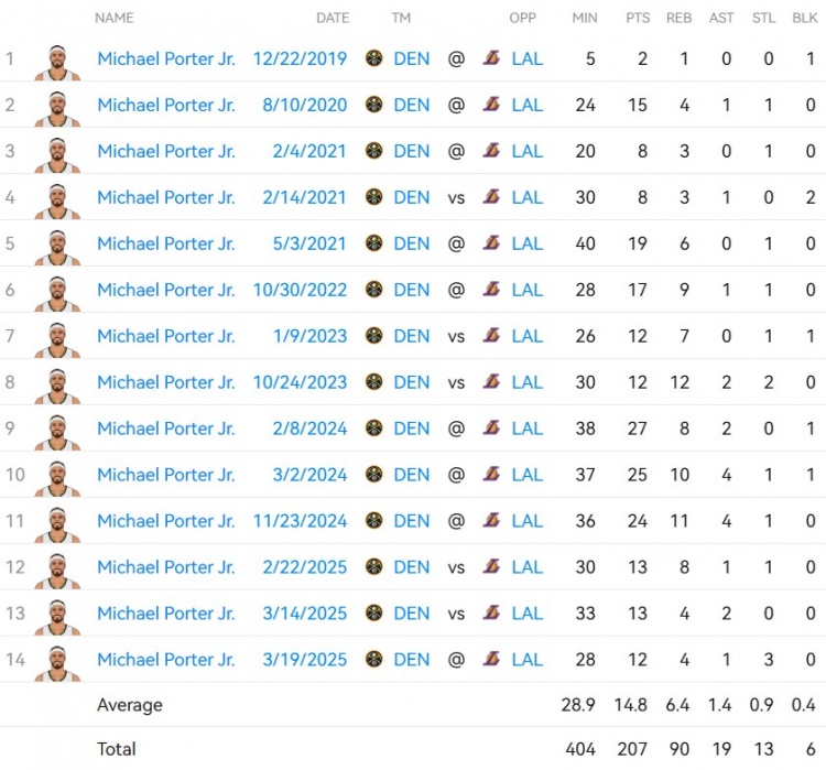 谈到效力掘金时期与湖人队的交锋,波特表示:“我一直很享受和湖人打季后赛,那种氛围令人振奋。他们的球迷总自信能赢我们,但事实上从未成功。不知道为什么,每次对阵湖人我总能打出高光表现——他们似乎始终找不到能有效穿过掩护、一对一限制我的防守球员。”